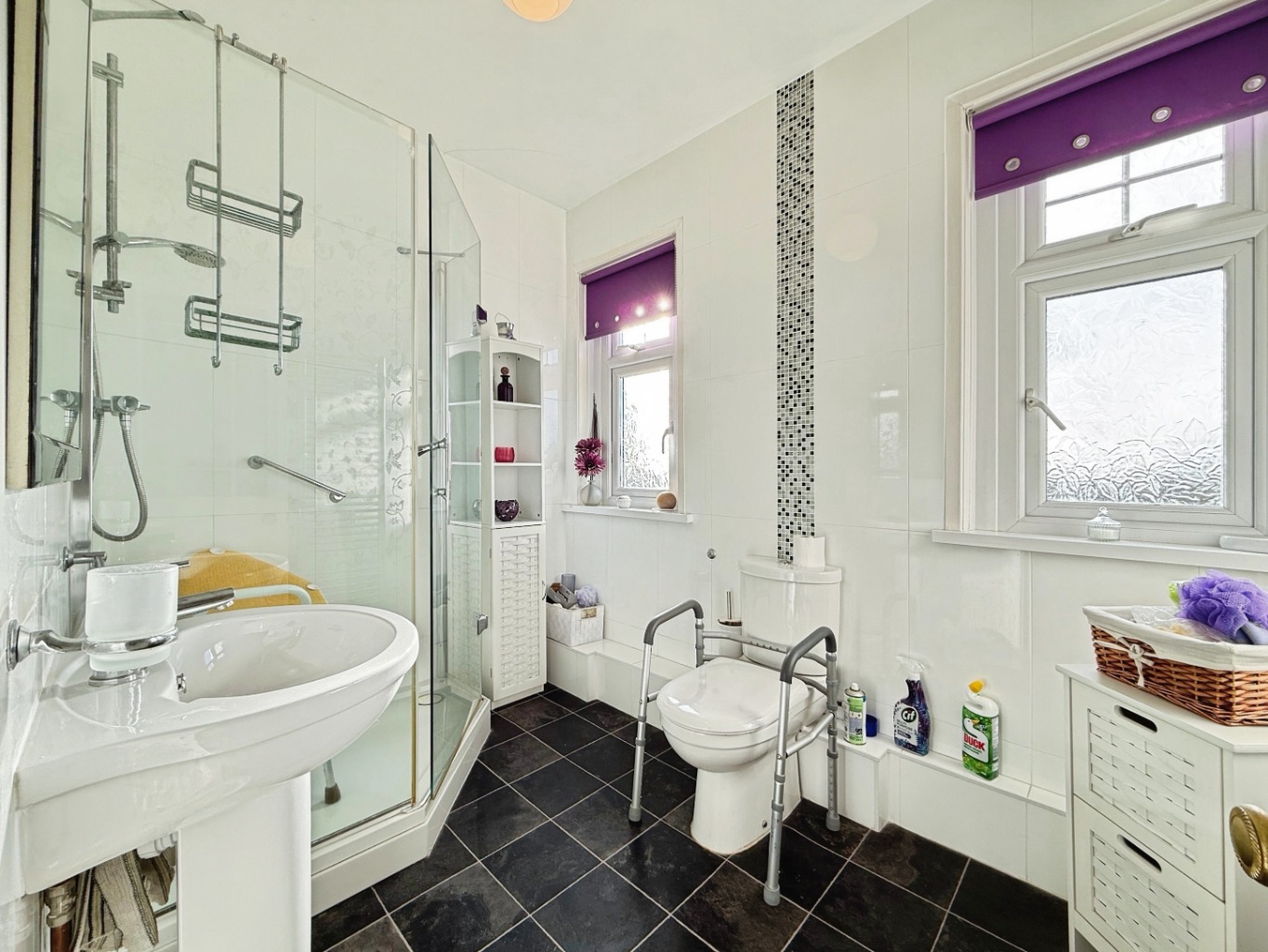 Fitted with a white three piece suite comprising of W/C, pedestal wash hand basin, walk in shower enclosure, partly tiled walls, tile effect flooring, uPVC double glazed frosted window to rear elevation x2.
