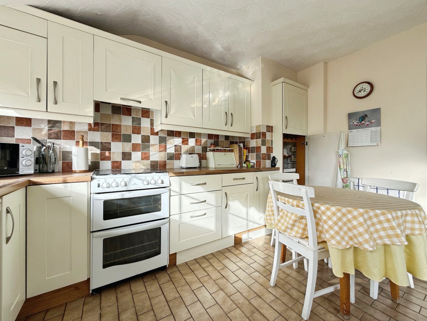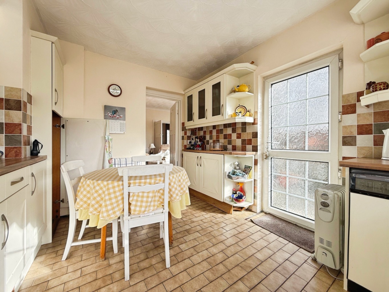 Fitted with a range of matching wall and base units with work surface over, stainless steel sink with mixer tap, space for freestanding cooker, space for under counter fridge/freezer, tiled splashback, uPVC double glazed window to rear elevation, tiled underfoot, storage cupboard housing boiler, uPVC double glazed door to side elevation.