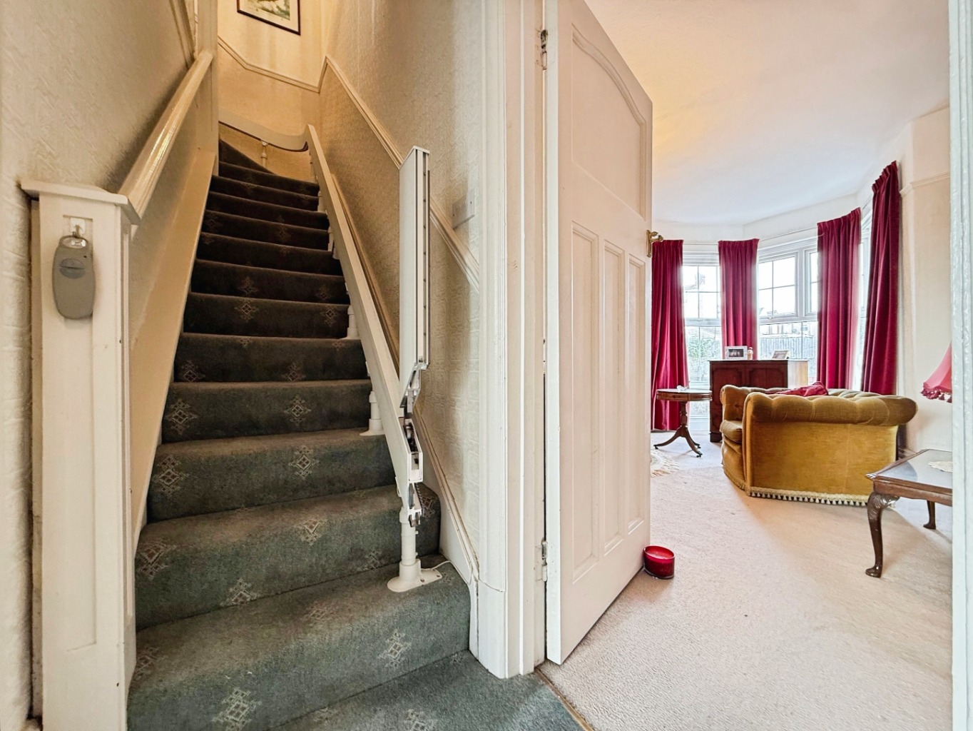 Carpeted underfoot, consumer unit, radiator, carpeted stairs to first floor accommodation, doors into: