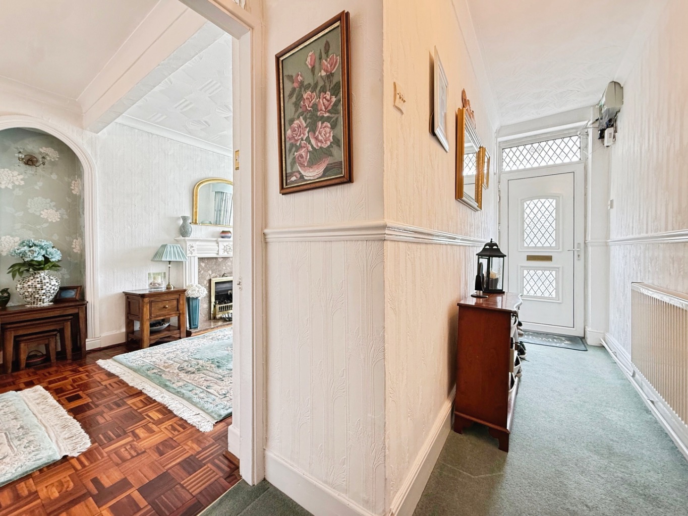 Carpeted underfoot, radiator, stairs to first floor accommodation, dado rail, coving to ceiling, under stairs storage area, doors into: