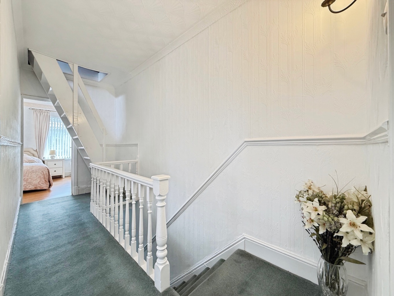 Carpeted underfoot, radiator, staircase to loft room, doors into: