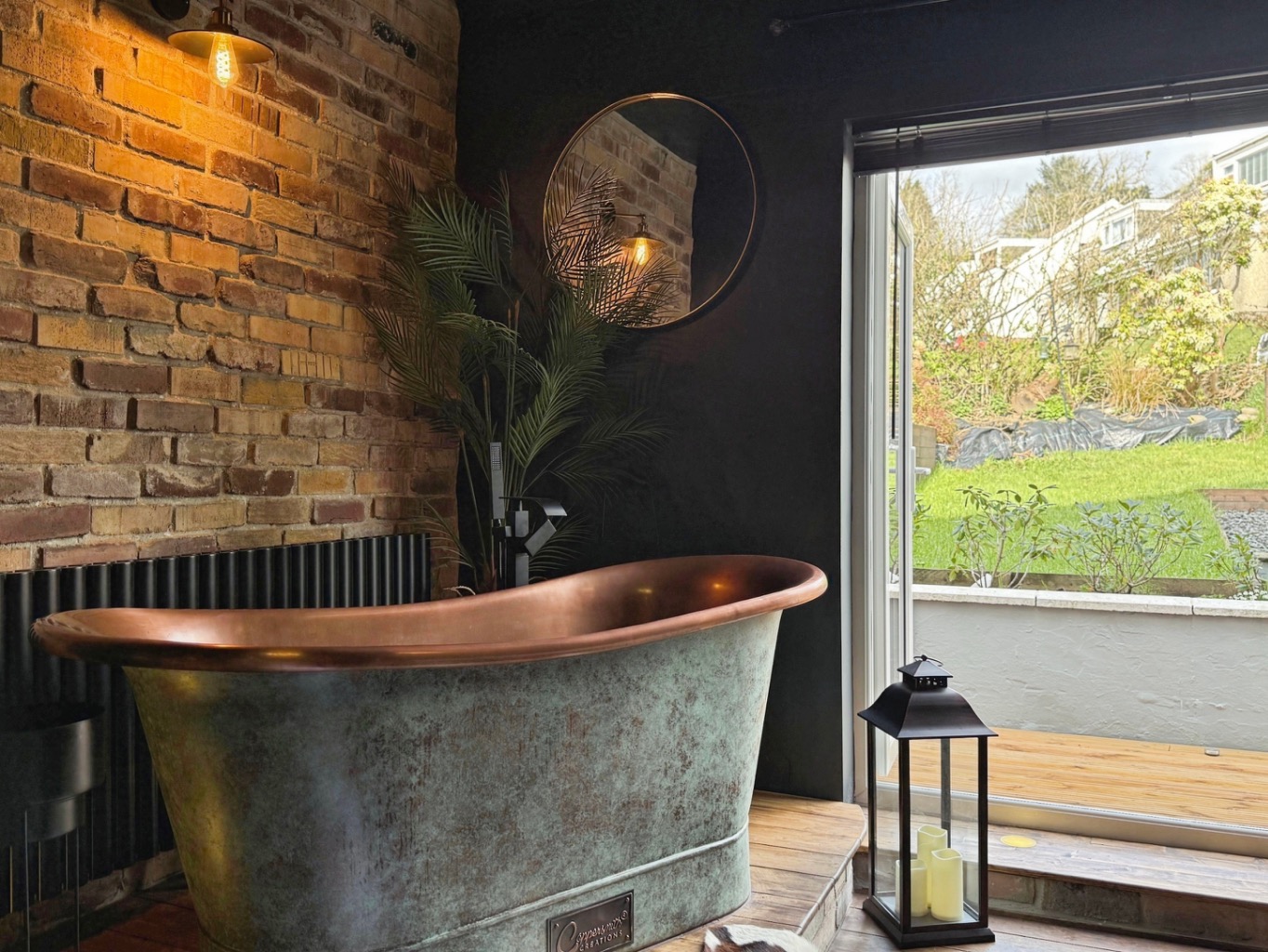 The standout principal suite is nothing short of indulgent, featuring a striking copper bath and a sleek rainfall shower, creating a spa-like sanctuary. A cosy log-burning stove and intimate seating nook add warmth and charm, perfect for unwinding. Elegant French doors open directly onto a tranquil, private front garden, where a picturesque pond, landscaped planting, and a secluded patio provide the ideal setting for morning coffee or evening drinks.