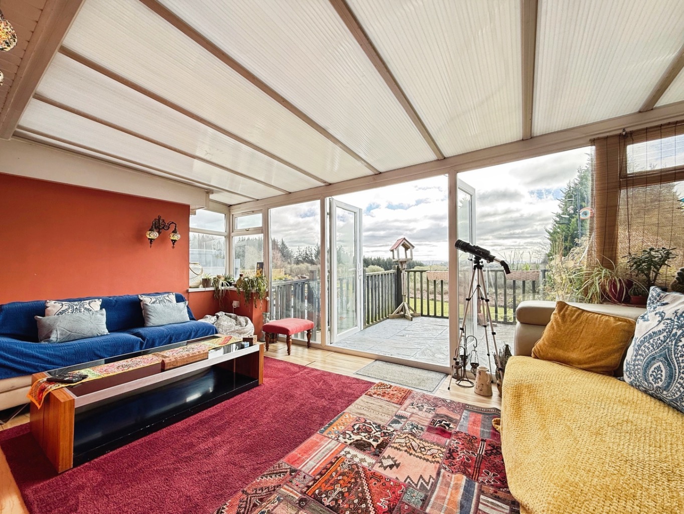 Laminate flooring, uPVC double glazed construction with patio doors to rear patio area with scenic views, radiator.
