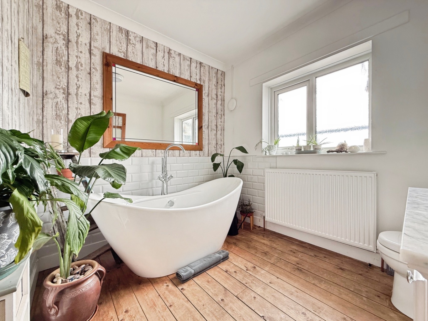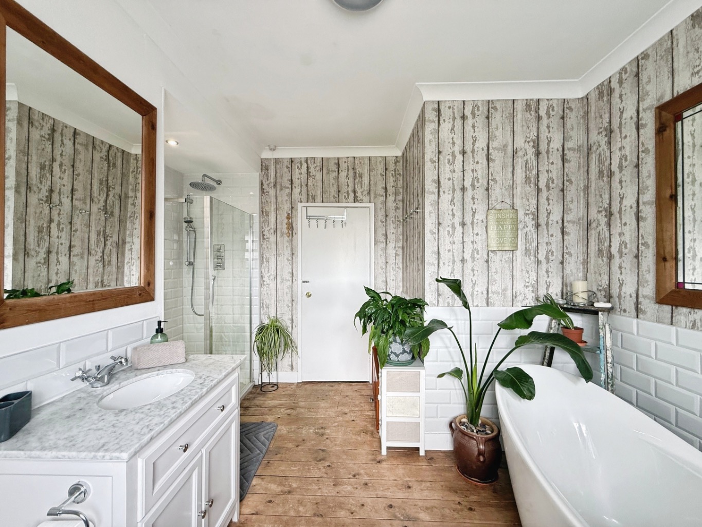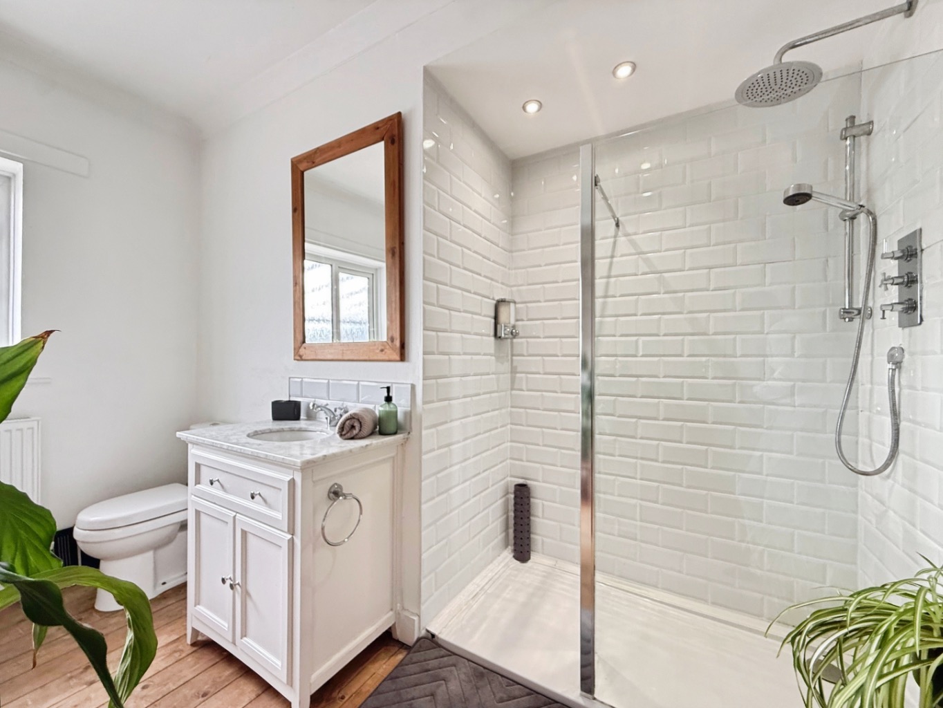 Fitted with a stylus suite comprising of W/C, sink set in vanity unit with marble counter top, walk in shower with glass modesty screen and rainfall shower, partly tiled walls, spotlights to ceiling, freestanding bath with polished chrome mixer tap, radiator, uPVC double glazed frosted window to rear elevation.