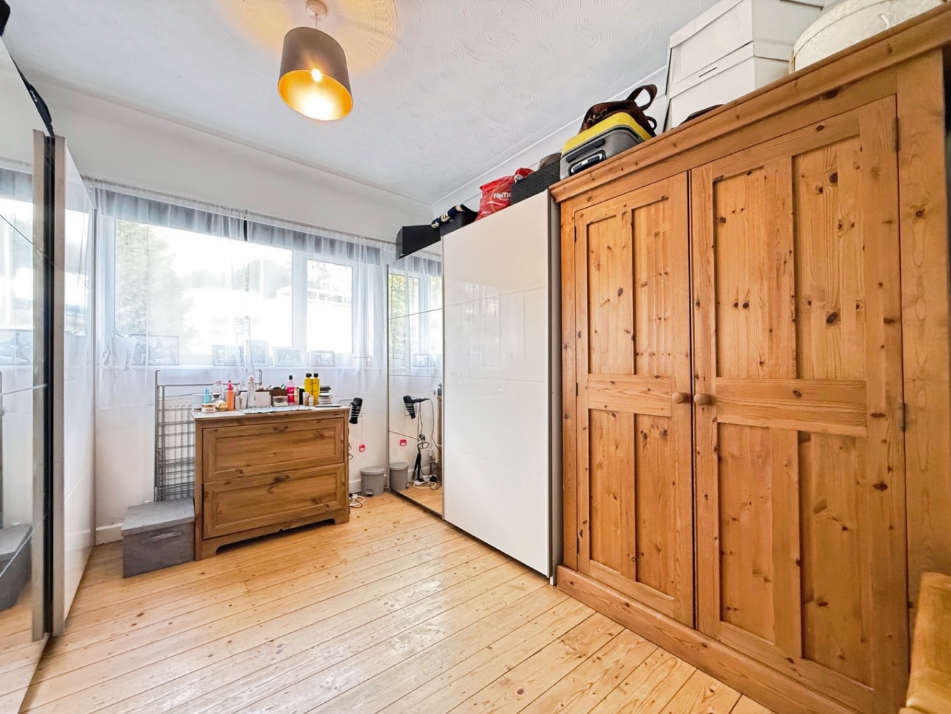 Exposed floorboards, storage cupboard x2, doors into:
