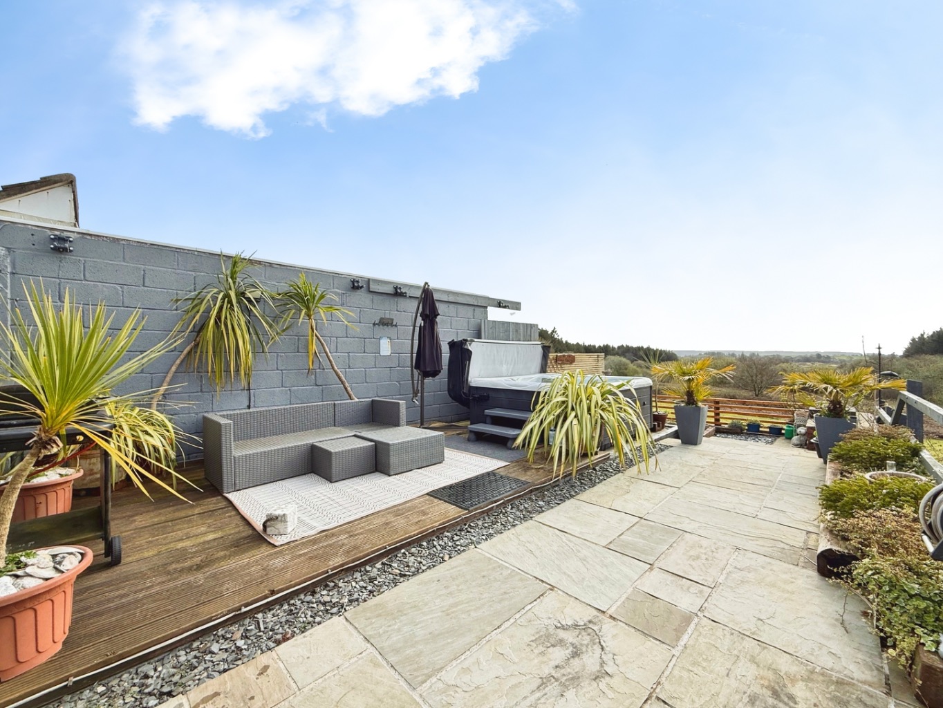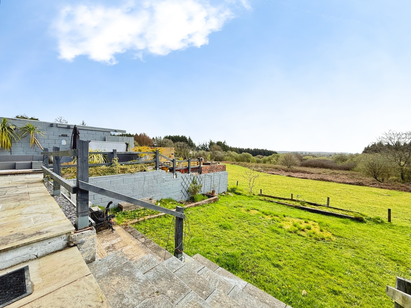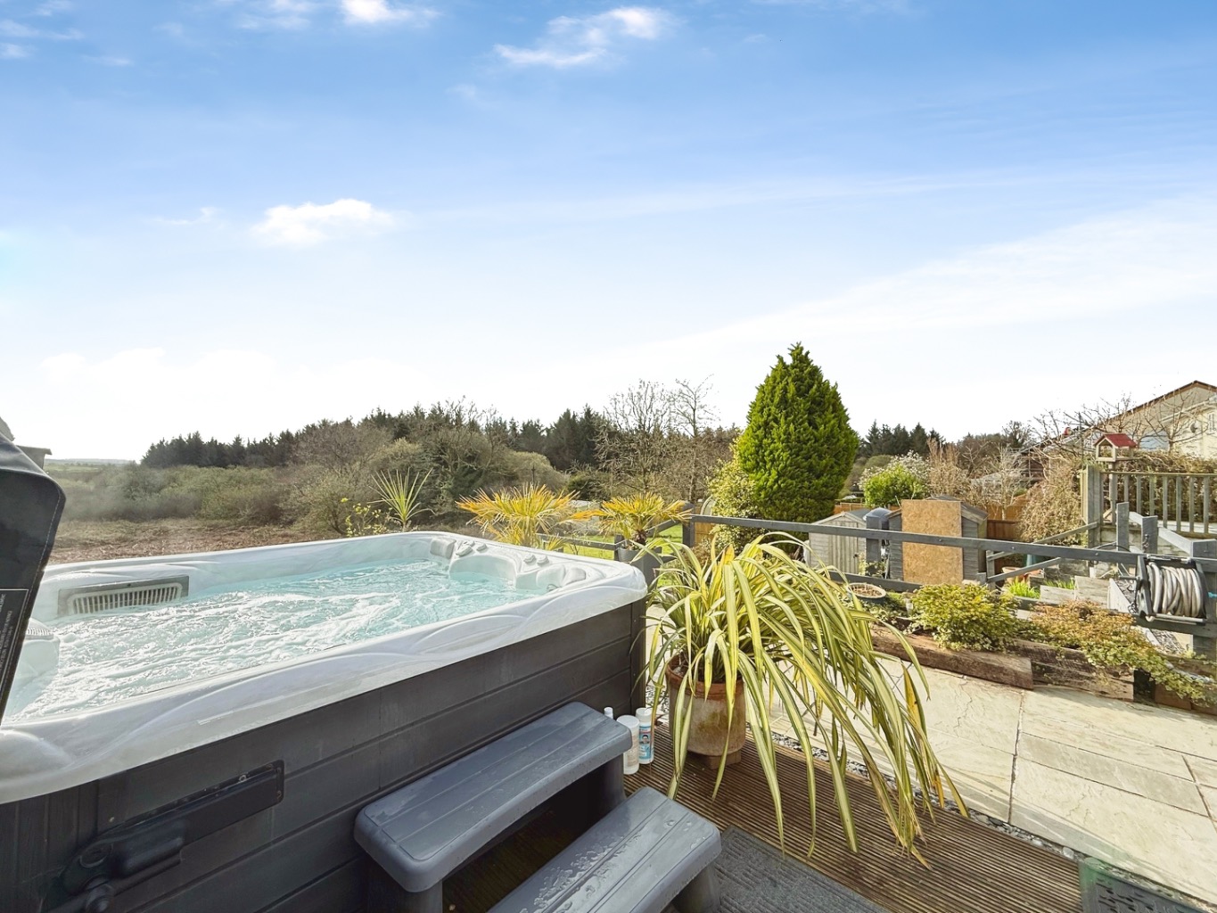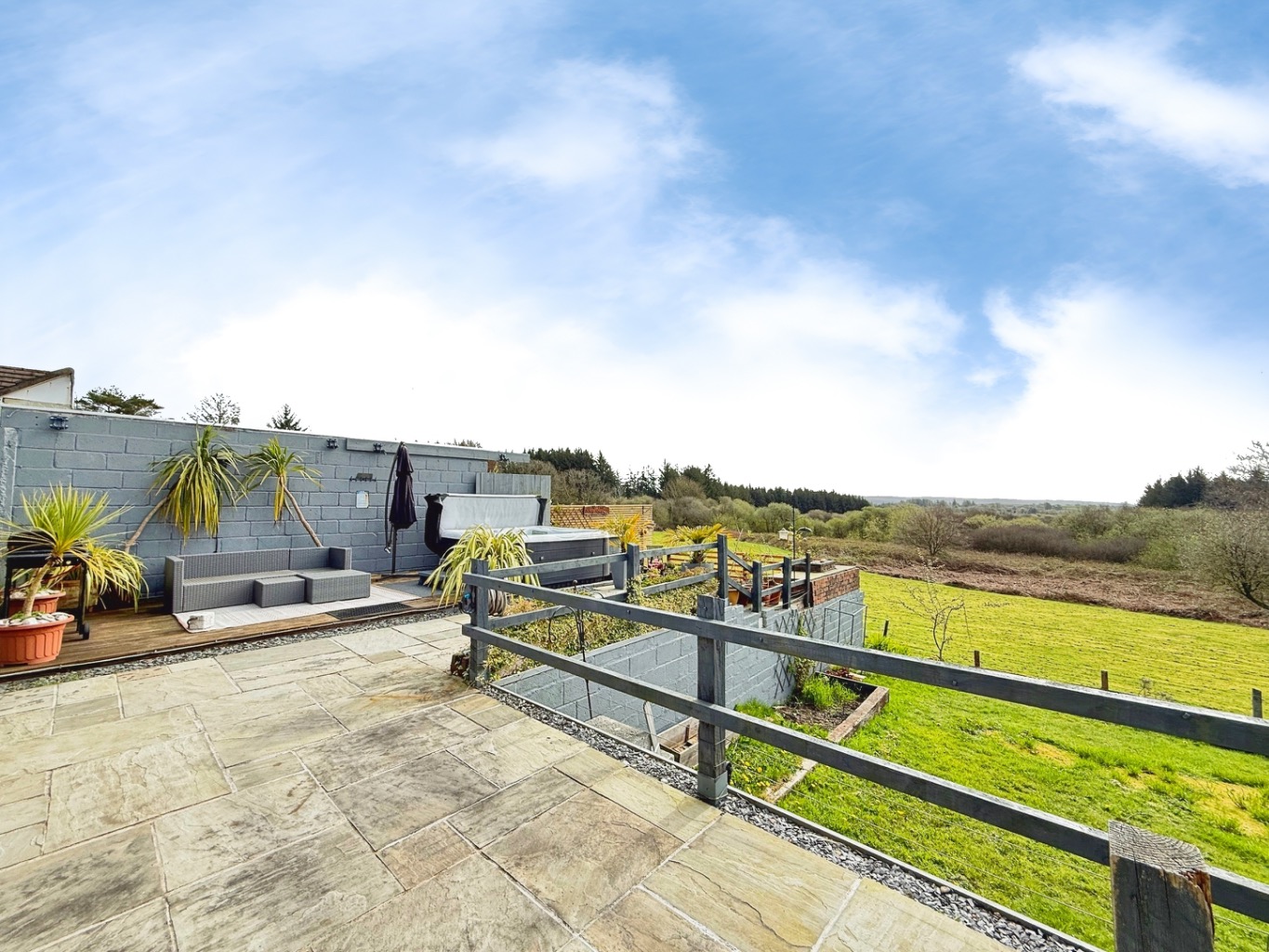 To the rear of the property there is a stunning garden featuring multiple seating areas and lawn space with scenic views over forestry. Featuring large Indian sandstone patio with covered outdoor pergola seating areas, decking with area for hotub, outdoor lighting.